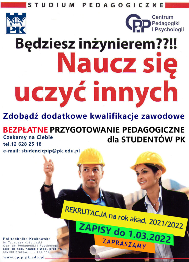 Centrum Pedagogiki i Psychologii PK ogłasza rekrutację na bezpłatny kurs przygotowania pedagogicznego Zapisy ma rok akademicki 2021/2022 trwają do 1 marca 2022. Więcej informacji na stronie cpip.pk.edu.pl